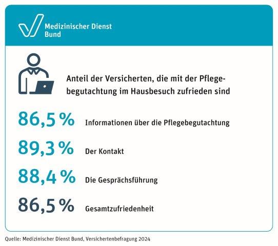 Es wurde danach gefragt, wie die Gutachterin oder der Gutachter des Medizinischen Dienstes das Gespräch geführt hat. Bewertet wurden Fragen zum Einfühlungsvermögen und zum fachlichen Inhalt der Begutachtung. Mit einer durchschnittlichen Zufriedenheit von 88,4 Prozent waren die im Hausbesuch begutachteten Personen mit der Gesprächsführung zufrieden.
